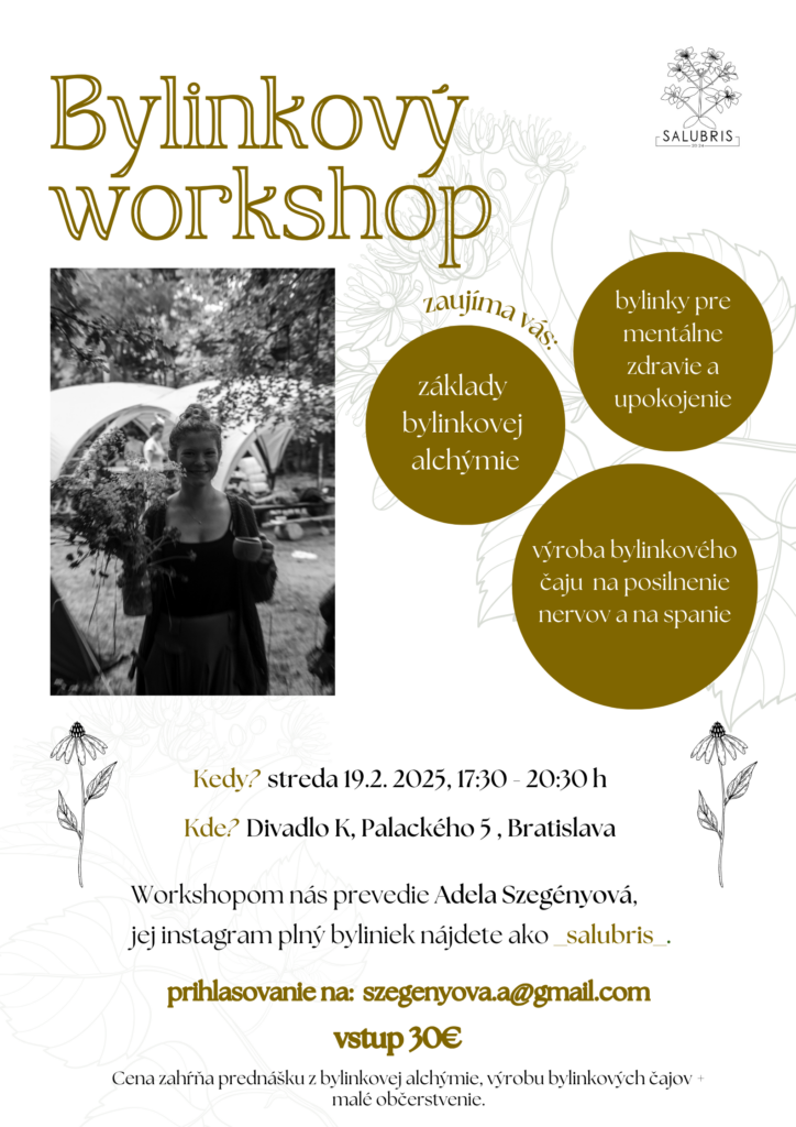 Bylinkový workshop v Divadle K ponúka základné teoretické vedomosti z bylinkovej alchýmie. Prejdeme si bylinky vhodné pre duševné zdravie a vyrobíme si bylinkový čaj na posilnenie nervov, bylinkový čaj na spánok a harmančekovú masť.
